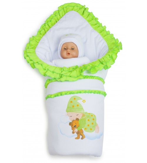 1.Одеяло 105х105см (состав: футер с начесом 100% хлопок, утеплитель - синтепон, подкладка - футер с начесом 100% хлопок); 2.Шапочка р. 36-40 (состав: футер с начесом100% хлопок, утеплитель - синтепон, подкладка - трикотаж 100% хлопок); 3.Ползунки р. 18-56 (состав: футер с начесом 100% хлопок); 4.Распашонка р. 18-56 (состав: футер с начесом 100% хлопок); 5.Пояс для одеяла.